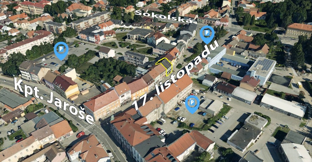 Masážní studio se nachází v 1. patře žlutě zvýrazněné budovy.